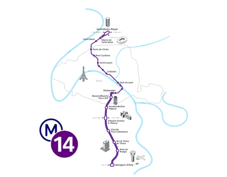 Pour répondre à la volonté d’en faire la liaison principale nord-sud du réseau de métro parisien, elle relie Saint-Denis Pleyel à l’Aéroport d’Orly et dessert une dizaine de villes, un aéroport, des centres hospitaliers et d’importantes zones d’activité économique.